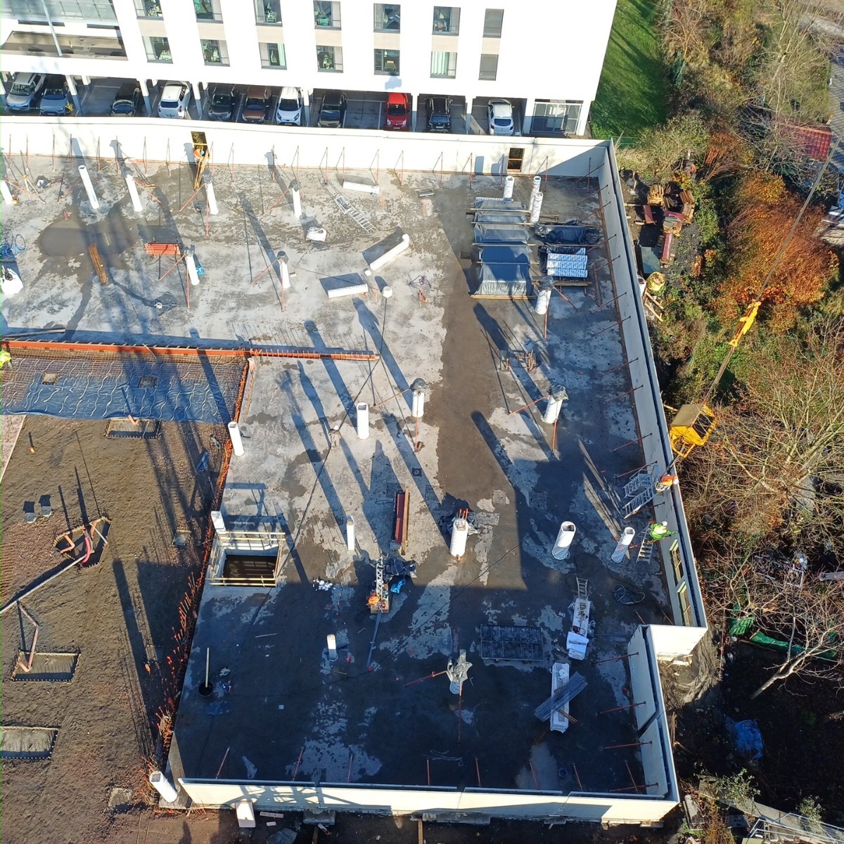 Après une phase de préparation minutieuse du dossier de production et l’assainissement du terrain, le chantier a débuté au printemps 2025. Travaux de terrassement, fondations, pose de pieux pour la  construction du futur parking souterrain… Le chantier, réalisé par les sociétés du Groupe Gehlen, progresse à un rythme soutenu, même si son avancée reste encore peu visible en surface. Plus récemment, l’installation de la grue marque une nouvelle étape : les premiers bâtiments vont petit à petit sortir de terre.